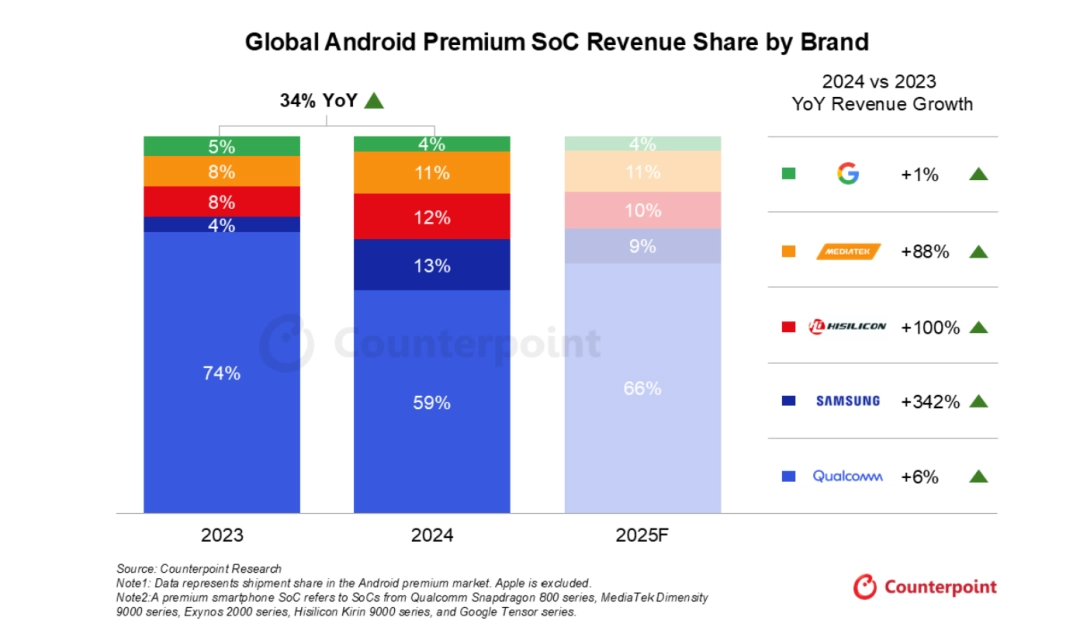 IT之家 5 月 15 日消息,根据 Counterpoint Research《2024 年 Q4 全球智能手机 SoC 营收与预测追踪报告》显示,得益于消费者对高端机型的强劲偏好,2024 年安卓高端智能手机系统级芯片(SoC)营收同比增长 34%。出货量增长和平均售价(ASP)提升共同推动增长。IT之家附排名如下: